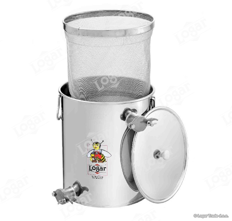 Cedilna posoda je namenjena predvsem cejenju medu že ob samem točenju medu. Privarjeni ima dve nerjaveči odtočni pipi, ki lepo odrežeta med. Zgornja odtočna pipa je namenjena pretakanju precejenega medu v nižjo posodo, spodnja pa služi za končni izpust medu iz posode. V posodi je fino cedilo fi 30,5 x 34 cm iz fine nerjaveče tkanine z veliko cedilno kapaciteto .