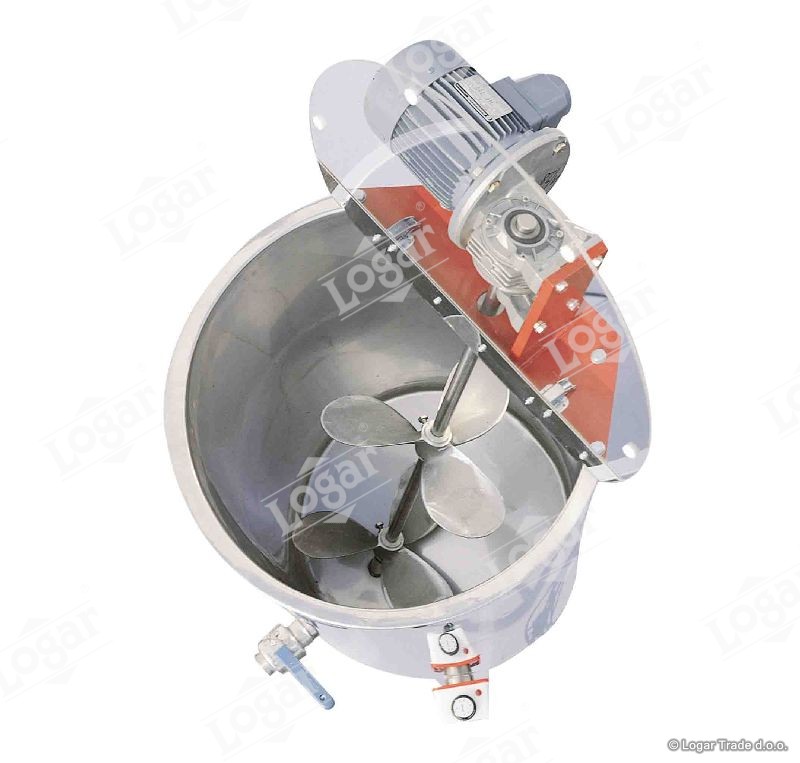 Dvoplaščna posoda za homogenizacijo medu z gretjem in mešalom. V reduktorsko gonilo je poševno vpeto dvojno lopatično mešalo, ki je fiksirano tudi v dno posode. Mešalo je po višini nastavljivo, da lahko meša tudi takrat, ko posoda ni polna. Dno notranje posode je nagnjeno proti izpustu, da med lahko v celoti izteče iz posode. Posoda je na 3 nogah. Pokrov je opremljen z varnostnim stikalom, ki preprečuje odpiranje pokrova med delovanjem. Nerjaveč kroglični ventil 2'' je vgrajen na najnižjo točko. Posoda je v celoti izdelana iz nerjavečih materialov kvalitete 1.4301, primernih za stik z živili.