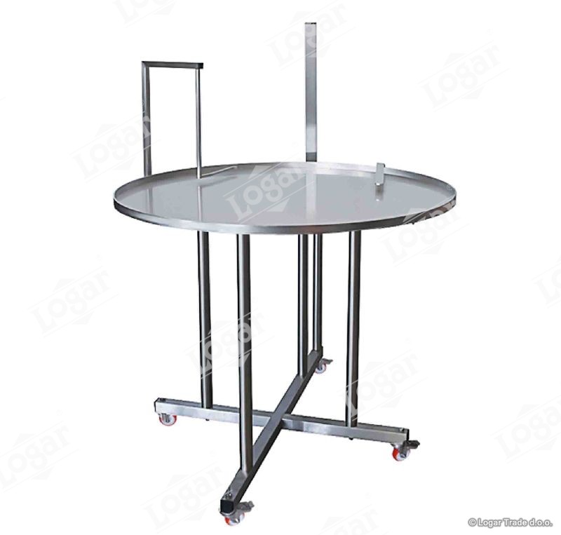 Krožna miza fi 100 cm z zbiranjem kozarcev v sredini je izdelana za priklop na polnilno napravo Nassenheider Fill up 2. Izdelana je iz nerjavečega jekla AISI 304, na kolesih in s povišanim stativom 70 cm.