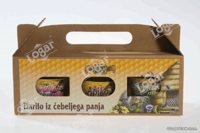 Medeni trojček sestavljajo: cvetlični in kostanjev med 250 g ter apiko 250 g (med obogaten z matičnim mlečkom, cvetnim prahom, in propolisom). Medeni izdelki so pakirani v lično oblikovano kartonsko emblažo.
