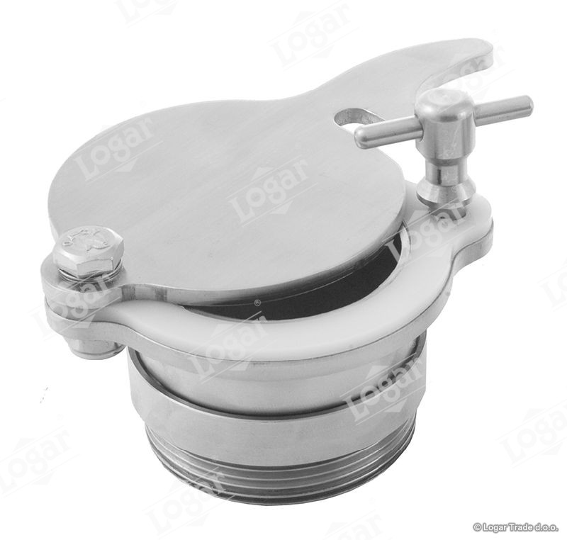 Nerjaveča odtočna pipa s ploščatim tesnilom iz umetne mase, za vgradnjo v navojno spojko 2'' s pozicionirno matico, ki odtočno pipo dodatno fiksira.
