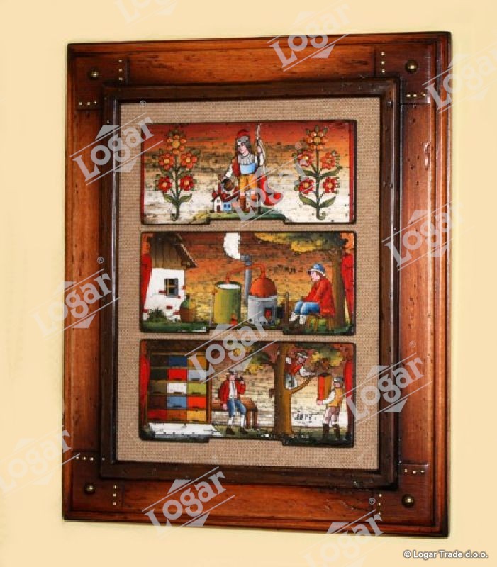 Tri panjske končnice v okvirju iz lipovega lesa. Različni motivi.
