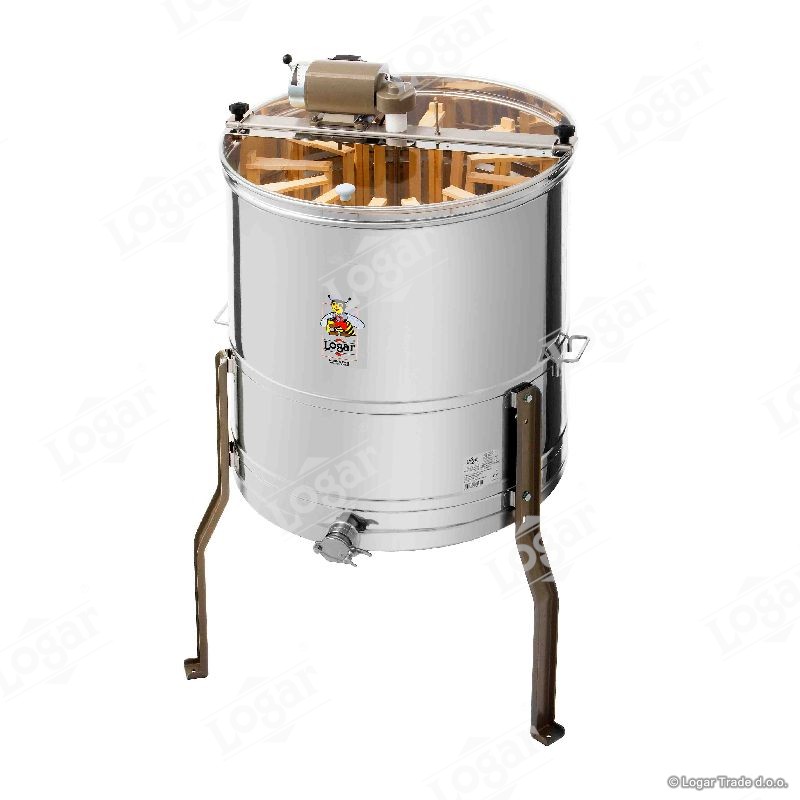 Točilo za radialno točenje 12 satnikov z reduktorskim motorjem 110W / 230V in varnostnim stikalom, ki ustavi delovanje motorja, če odpremo pokrov točila. Najmodernejša tehnologija nam omogoča inovativno izdelavo dna točila. Dno soda je varjeno brez notranjih robov in je nagnjeno proti izpustu. Nerjaveča odtočna pipa je vgrajena na najnižjo točko, da lahko ves med odteče iz točila. Vsi deli točila, ki pridejo v stik z medom, so izdelani iz materialov, ki so primerni za prehrano. Pokrov točila je izdelan iz prosojnega akrilnega stekla. Posebna konstrukcija nog omogoča stabilno postavitev točila.