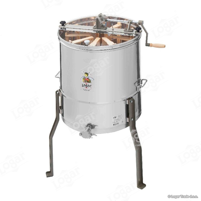 Točilo za radialno točenje 9 satnikov z ročnim enosmernim gonilom z zavoro. Najmodernejša tehnologija nam omogoča inovativno izdelavo dna točila. Dno soda je varjeno brez notranjih robov in je nagnjeno proti izpustu. Privarjena nerjaveča odtočna pipa je vgrajena na najnižjo točko, da lahko ves med odteče iz točila. Čiščenje točila je enostavno. Vsi deli točila, ki pridejo v stik z medom, so izdelani iz materialov, ki so primerni za prehrano. Pokrov točila je izdelan iz prosojnega akrilnega stekla. Posebna konstrukcija nog omogoča stabilno postavitev točila.