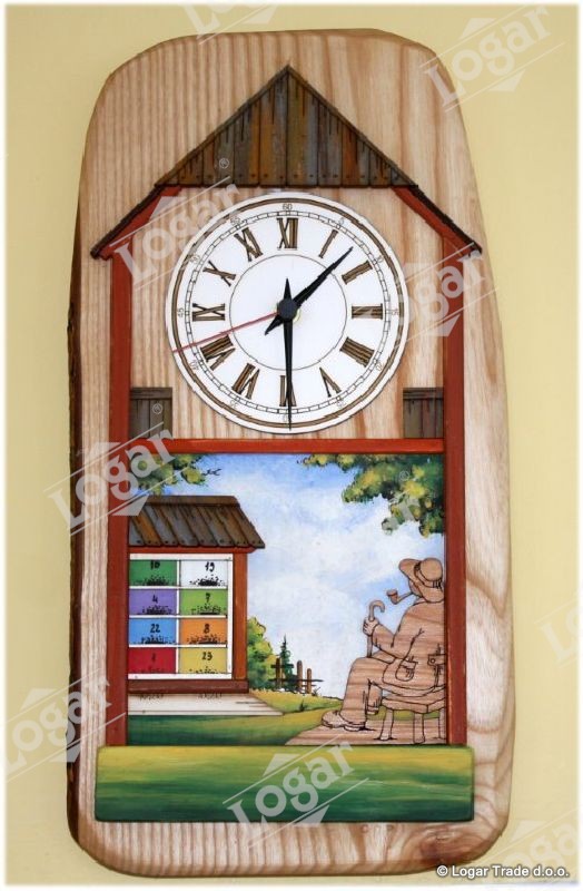 Stenska ura s čebelnjakom in čebelarjem pred njim. Izdelana iz lipovega lesa. Dimenzija ure: 22x44 cm
